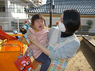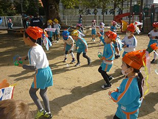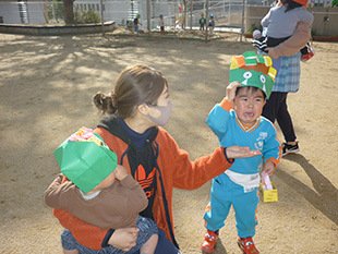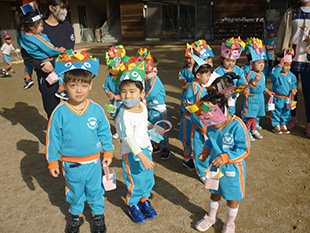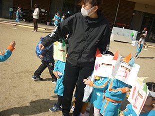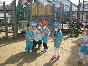 2月2日(火)の節分の日。みんなで豆まきをしました。自分で作った鬼のお面をつけて、「鬼は外~、福は内~!!」と大きな声で豆を思いきり撒いていると3匹の鬼が登場!!大泣きする子、先生にしがみつく子、鬼の登場に小さな子どもたちは大騒ぎ!!必死に豆を撒いて、鬼を追い払いました。