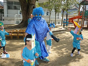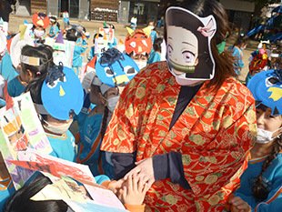 鬼がいなくなった後には、可愛いねずこの顔をした福の神様が幼稚園やってきました。ねずこ福の神の登場に鬼滅(きめつ)大好きな子どもたちは大喜びでした。