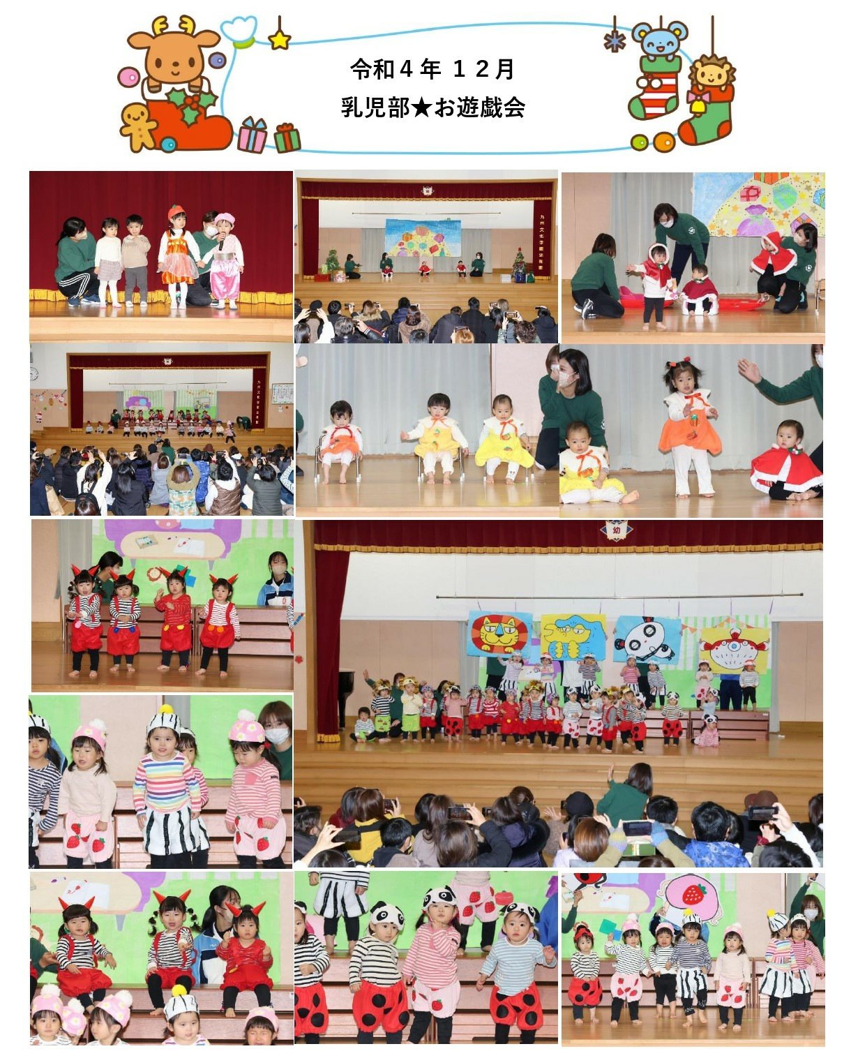2022年12月24日 12月 乳児部 べに組 さくら組 たんぽぽ組 ひまわり組 ひよこ組 乳児部★お遊戯会 12月末に乳児部のお遊戯会を実施しました!子ども達はたくさんのお客さんを前に少し緊張した様子も見られましたが、それぞれ一生懸命に練習の成果を発揮することができていました💛みんな、よく頑張りましたね!!! 古い記事一覧新しい記事