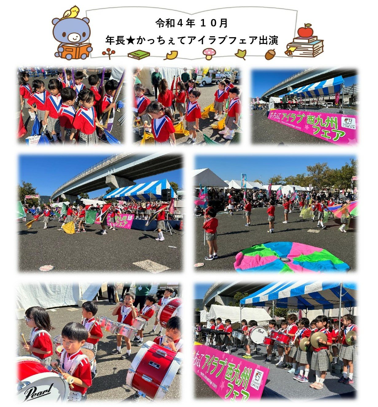 2022年10月29日 10月 幼児部 年長 年長★かっちぇてアイラブフェア出演 佐世保物産振興協会さんが主宰する「かっちぇてアイラブフェア」に年長児がマーチング披露で出演をさせいていただきました!「かっちぇて=仲間にいれて」という方言だそうですよ。少し汗ばむくらいの天気の日に、子ども達の元気な演奏が響き渡りました★★ 古い記事一覧新しい記事
