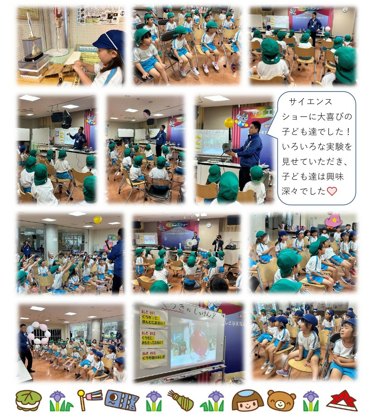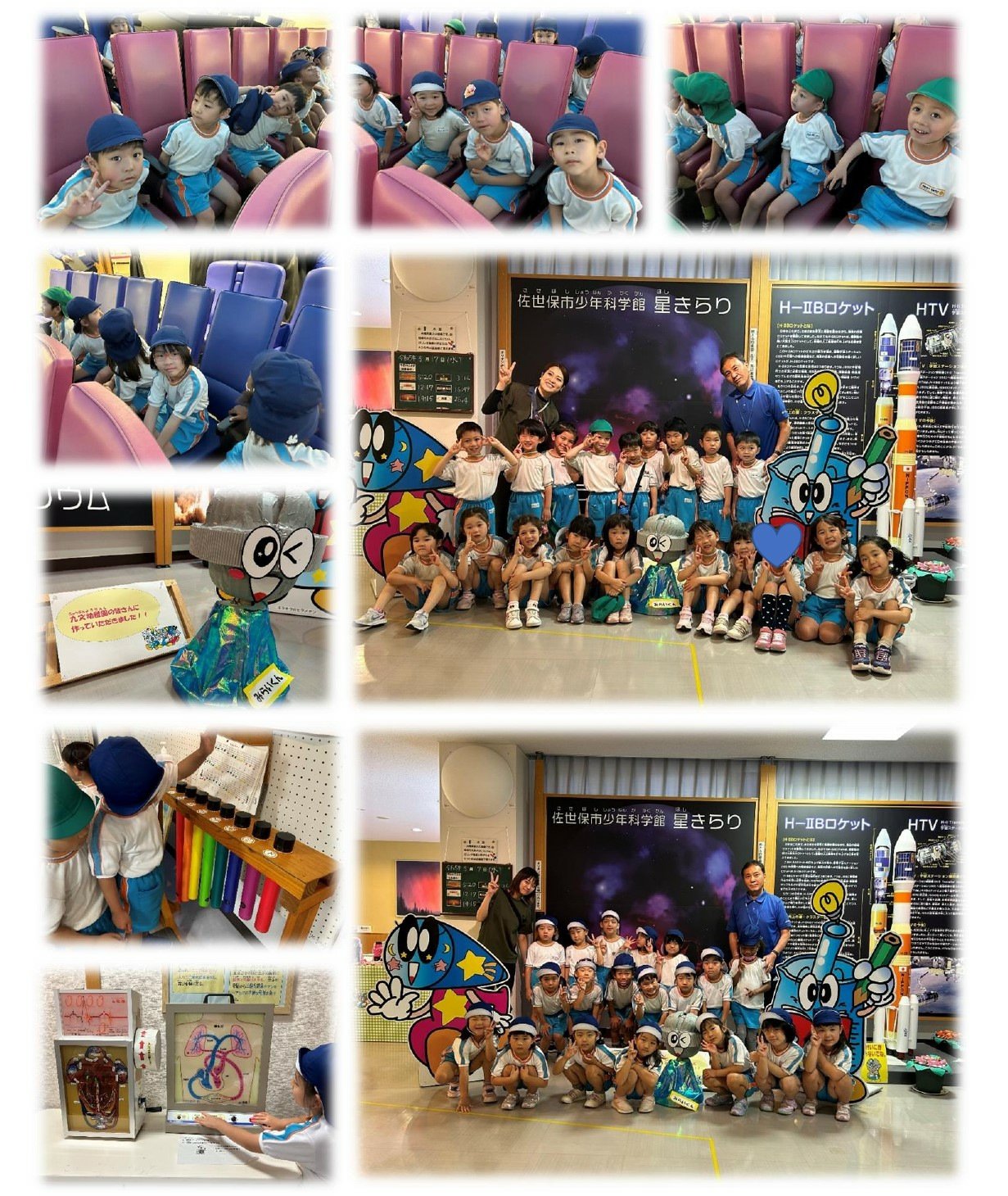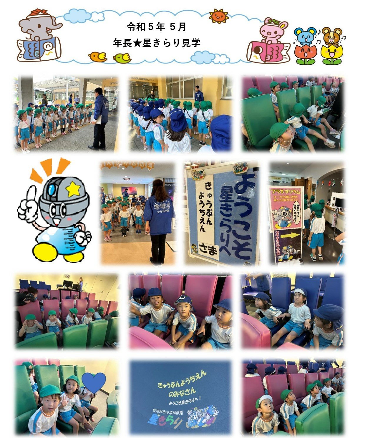 2023年05月17日 5月 年長 年長★星きらり見学 今日は星きらりにお出かけしました。プラネタリウムで見る星座や七夕の話に子ども達は興味津々で楽しんでいました。サイエンスショーでは空気の実験を見せていただき、歓声をあげながら見ている子ども達でした★ 古い記事一覧新しい記事