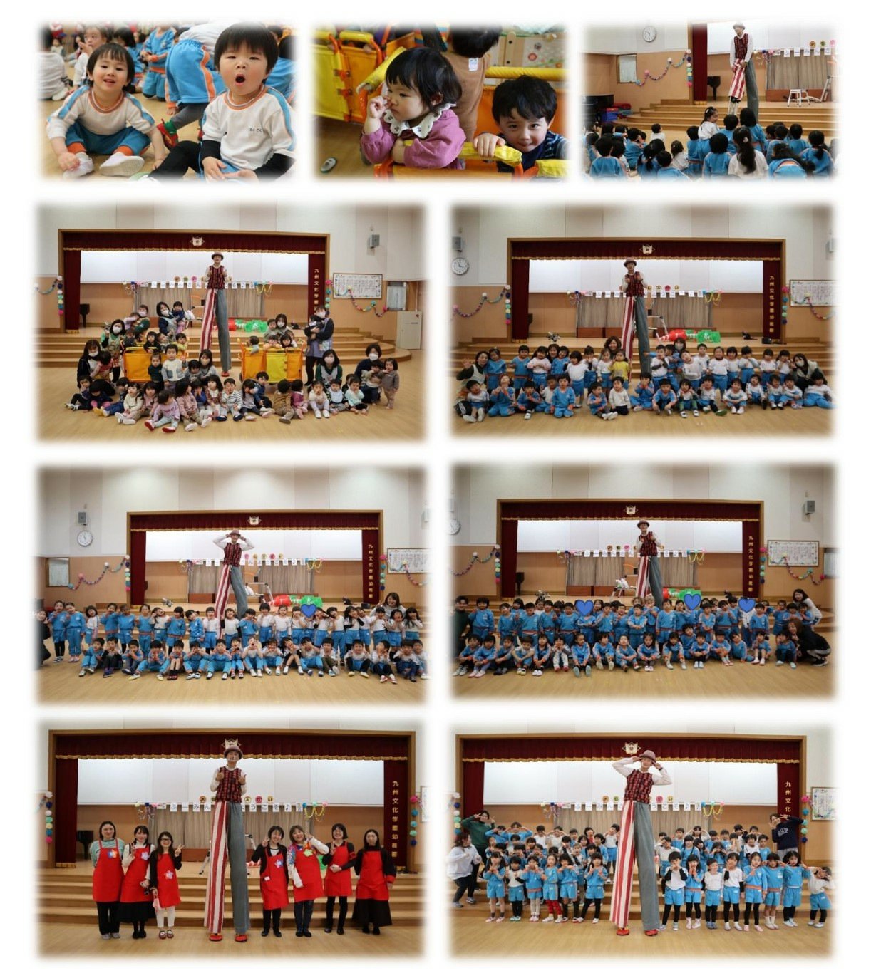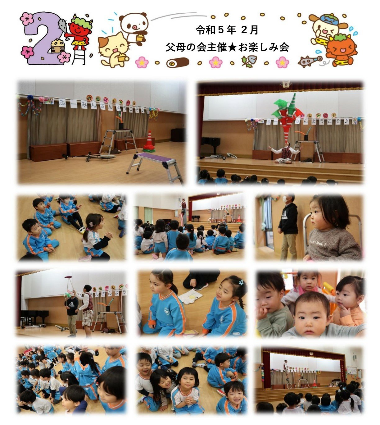 2023年02月28日 2月 乳児部 幼児部 父母の会主催★お楽しみ会 今日は幼稚園にfu-minnさんがいらっしゃって、楽しいパフォーマンスを沢山見せてくださいました!!終始満面の笑みを浮かべながら夢中で観賞する姿に、職員一同とても嬉しく感じました。父母の会の皆様、素敵な時間を準備して下さって、ありがとうございました💛 古い記事一覧新しい記事