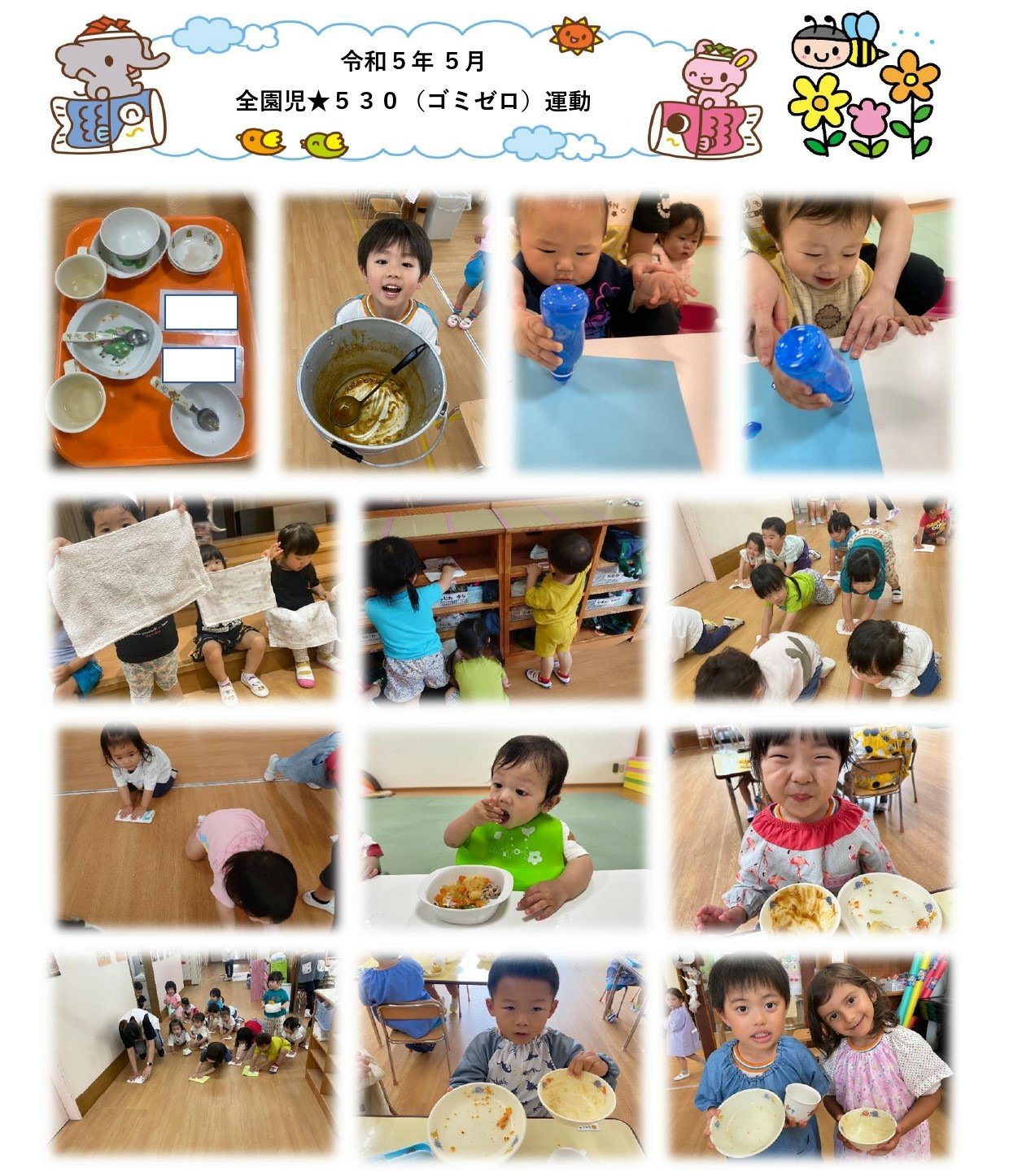 2023年05月30日 5月 幼児部 乳児部 全園児★530(ゴミゼロ)運動 今日は5月30日(ゴミゼロの日)にちなんで、様々な活動を行いました!!あいにくの雨天だったため、室内で美化活動をしたり、廃材を使った製作活動や給食を残さず食べることを頑張りました。 古い記事一覧新しい記事