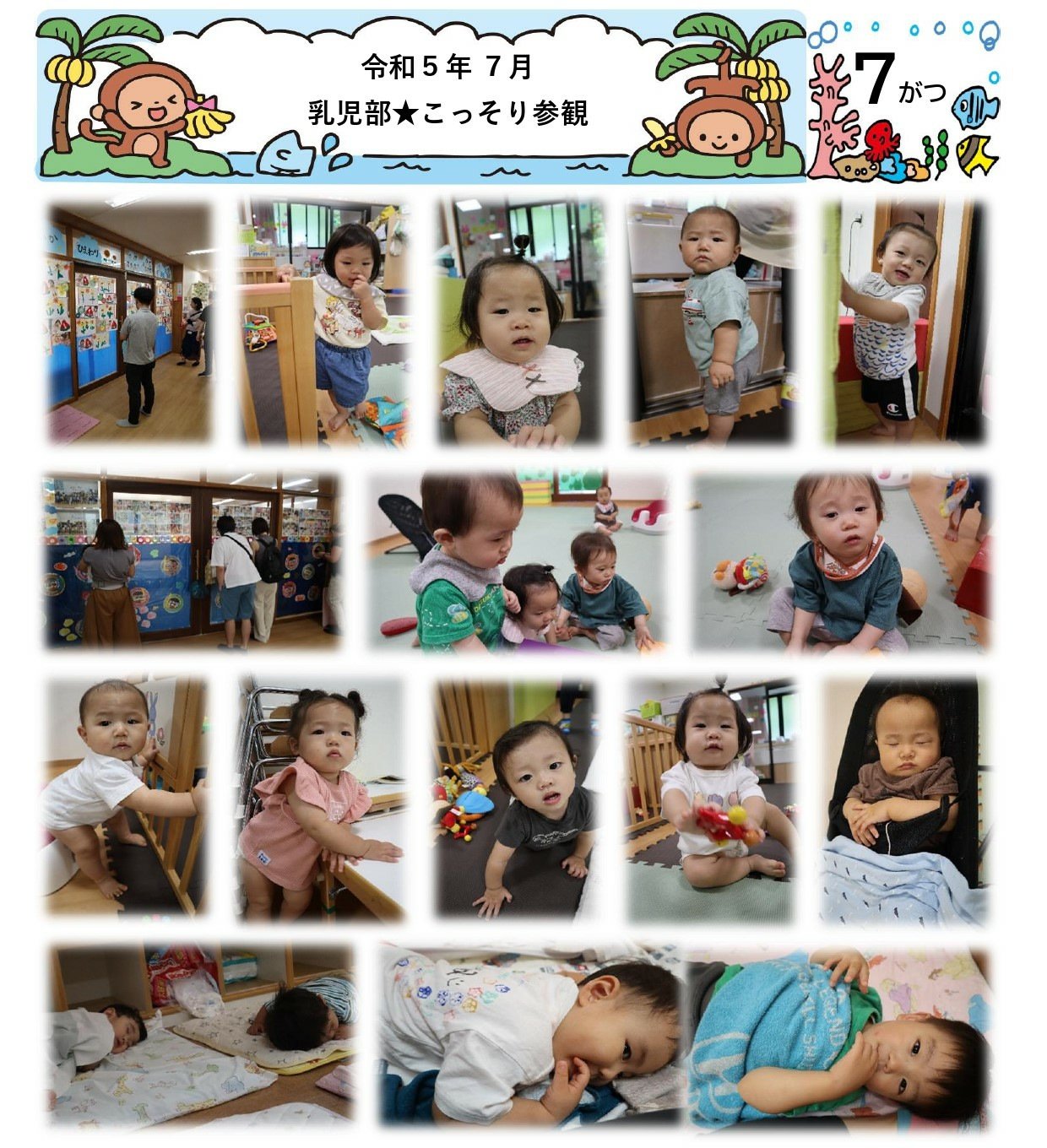 2023年07月11日 7月 乳児部 乳児部★こっそり参観WEEK 7月10日(月)~14日(金)にかけて、乳児部さんのこっそり参観WEEKでした!保護者の皆様、子ども達に見つからないよう参観にご協力いただきまして、ありがとうございました。普段の様子をゆっくりご覧いただけたのではないかと思います🎵 古い記事一覧新しい記事